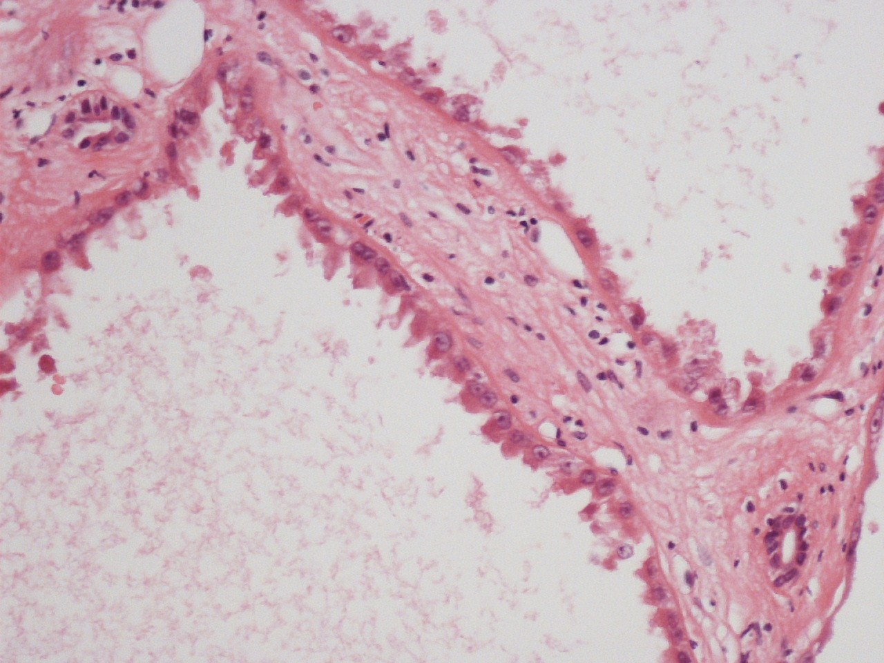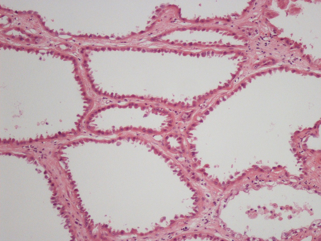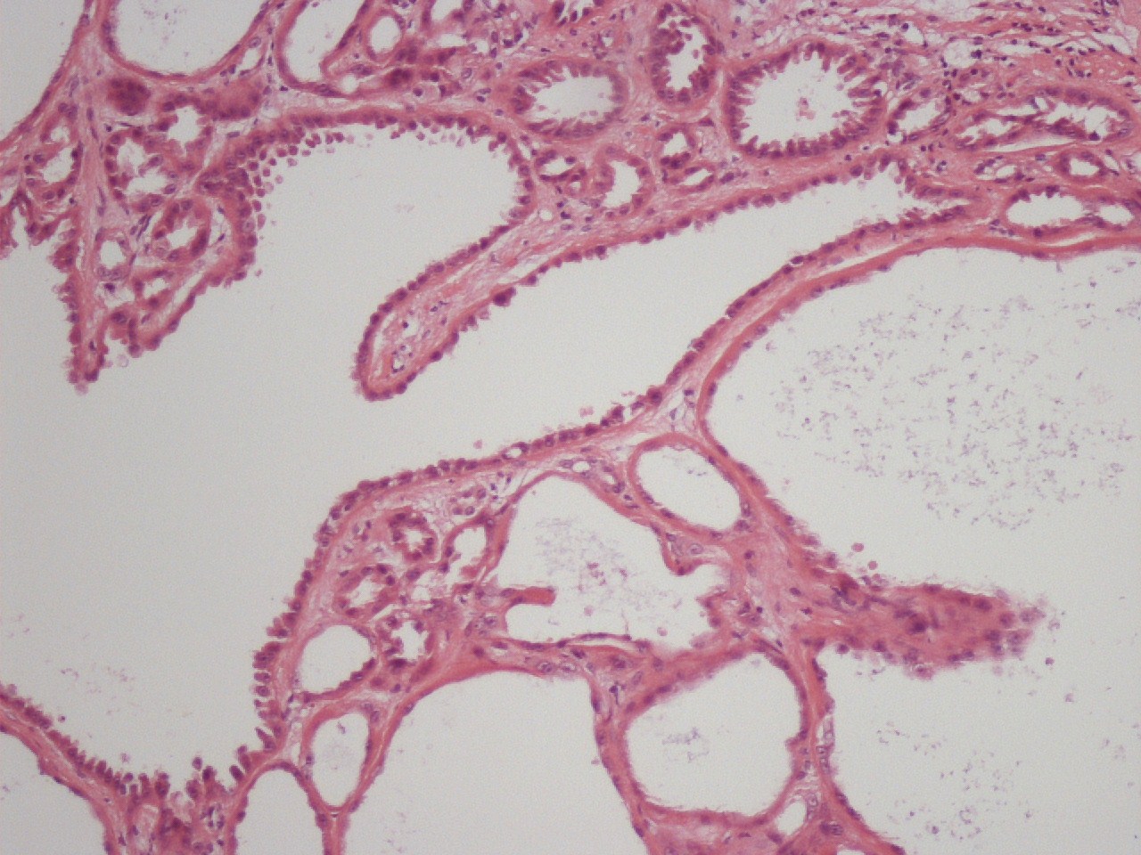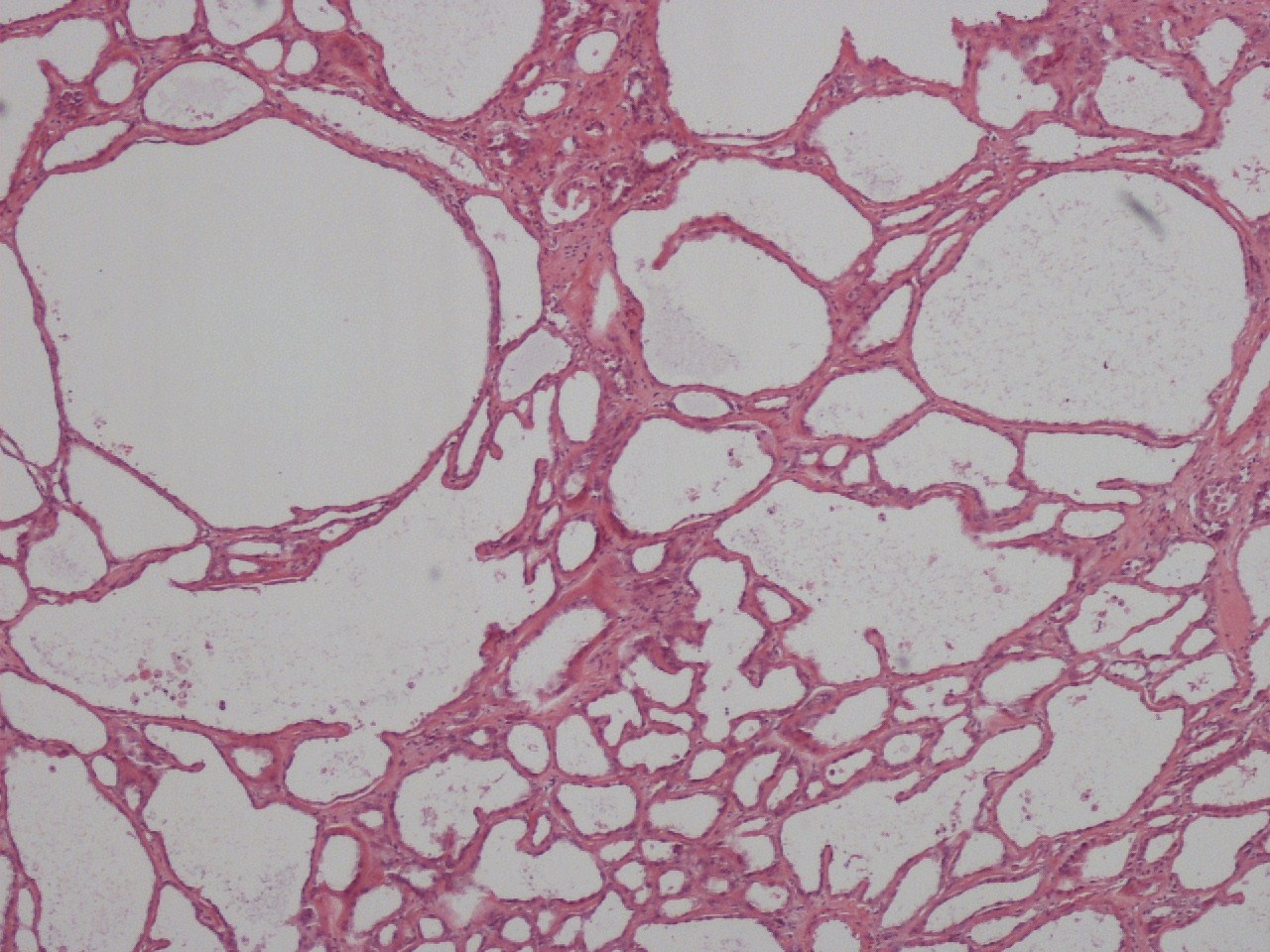Renal tumor from a 48 year old male. The tumor was 7.3cms in diameter and had a grey spongy morphology. It is composed of cysts of varying sizes. These are lined by a single layer of tumor cells. these are variously cuboidal, columnar or on occasion hob-nailed. The cytoplasm is eosinophilic and faintly granular. Nuclei are centrally placed and although showing minimal pleomorphism do have prominent single nucleoli. Mitoses are rare.