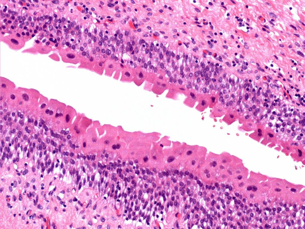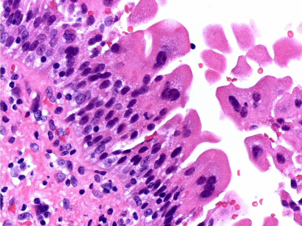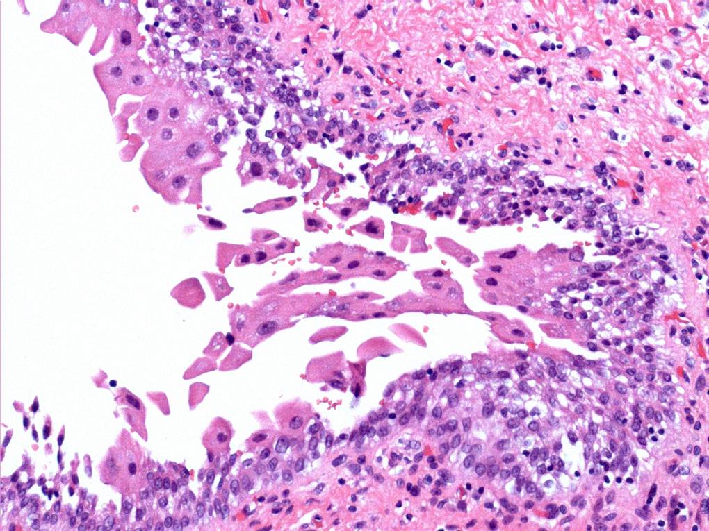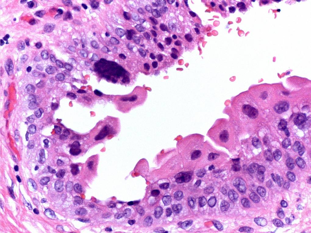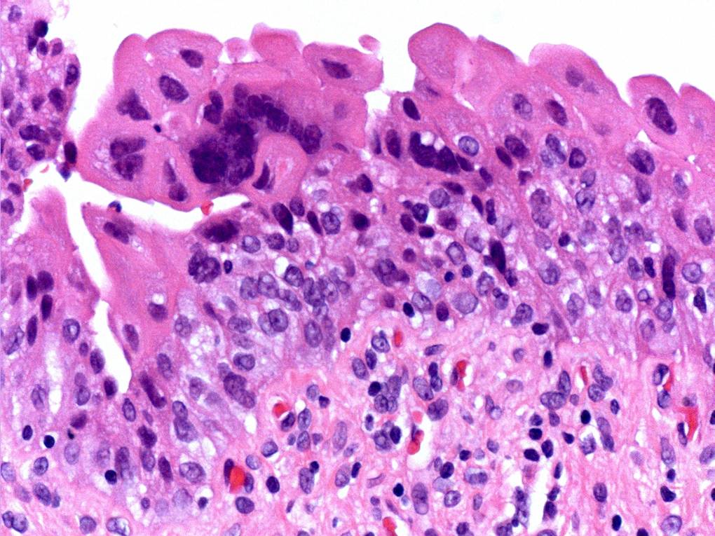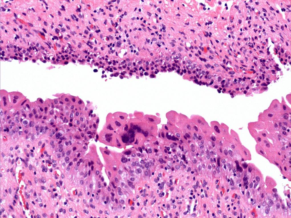 The main change here is ‘degenerative’ nuclear atypia in a rather unusually prominent umbrella cell layer. The underlying urothelium shows mild reactive changes in places with some chronic inflammation in the lamina propria.