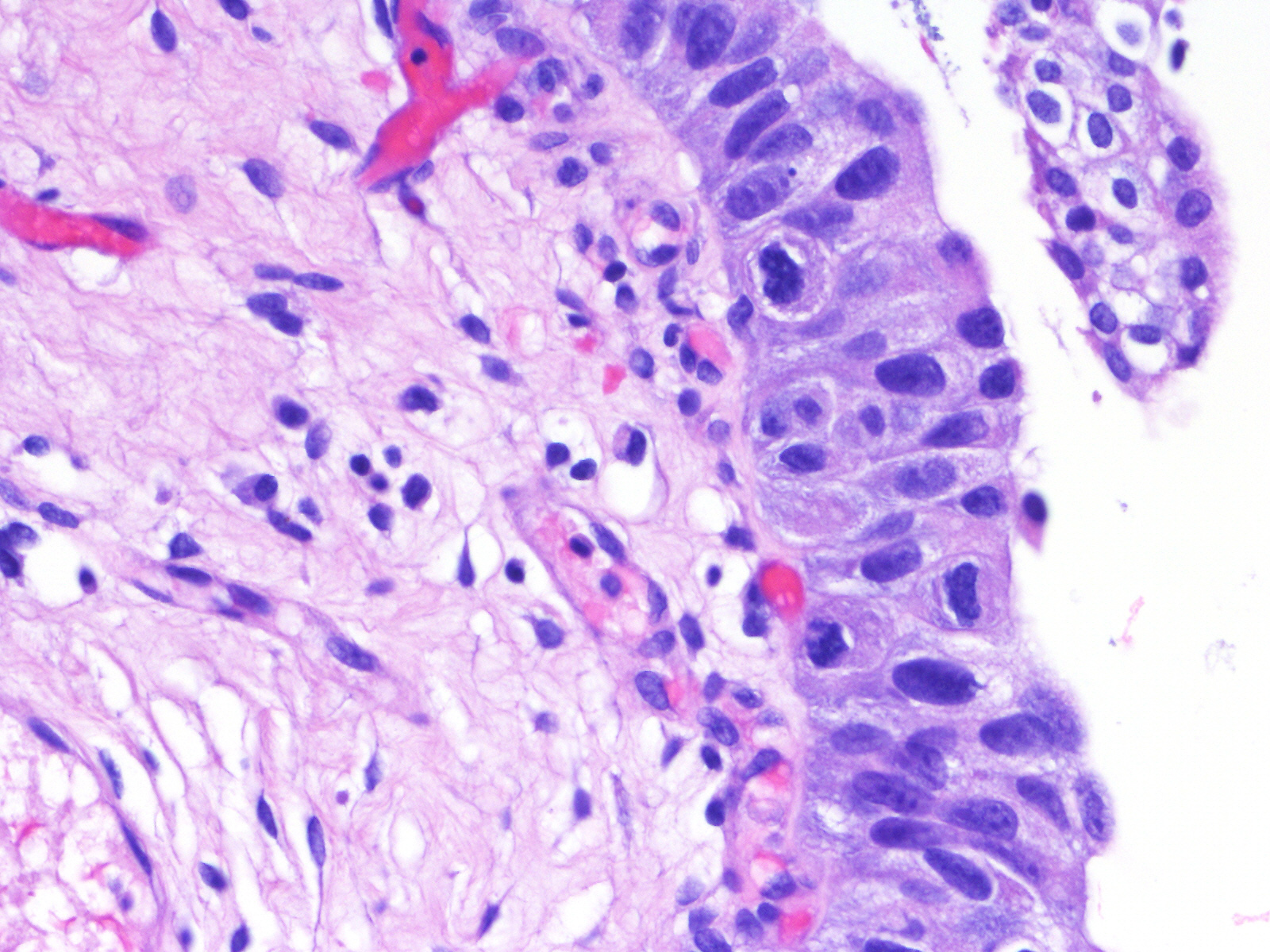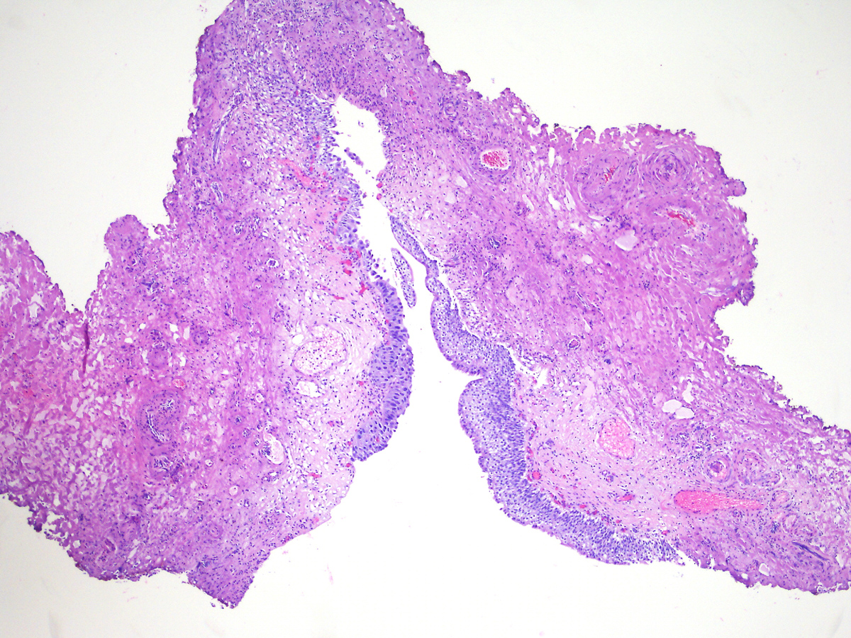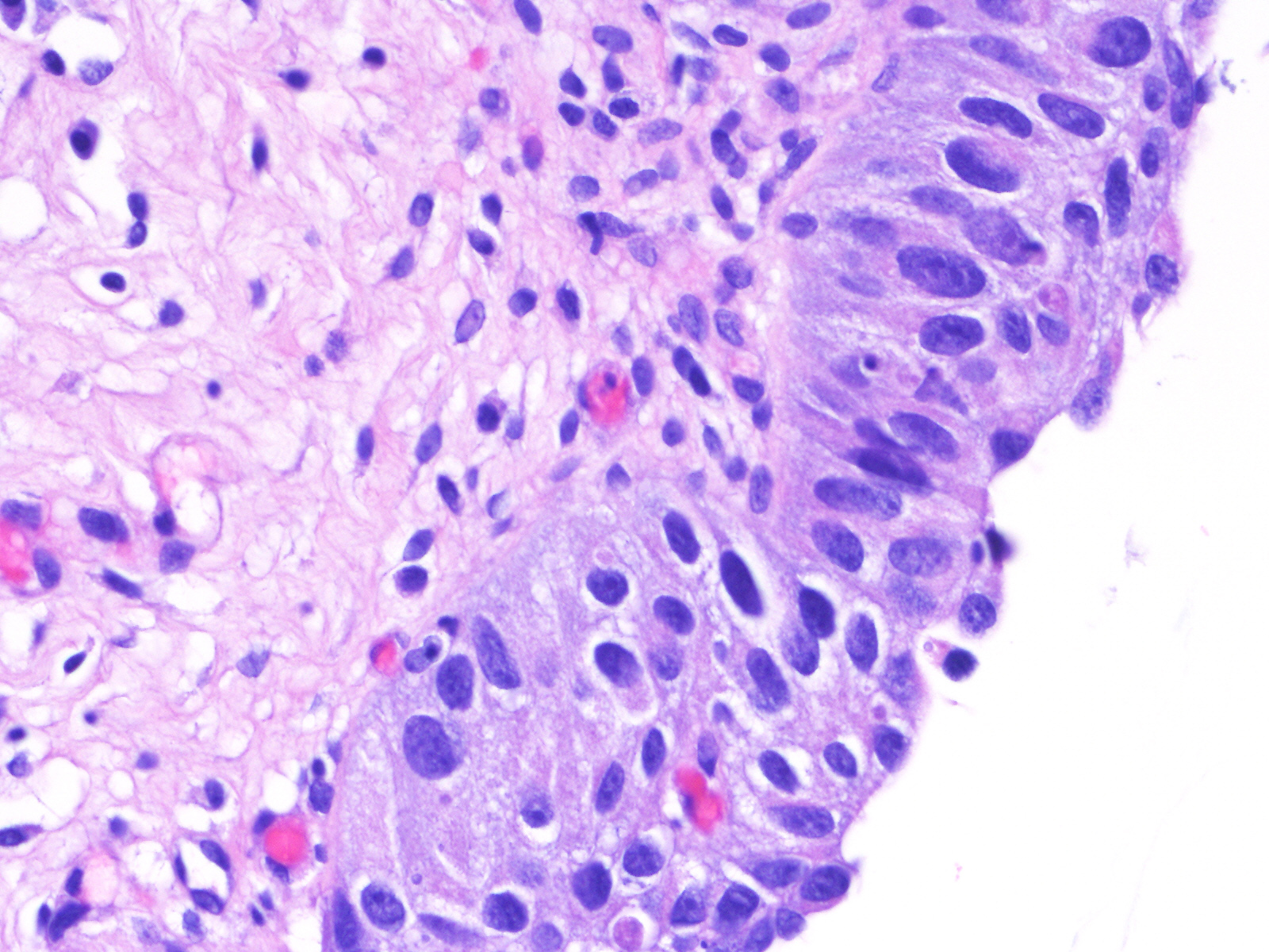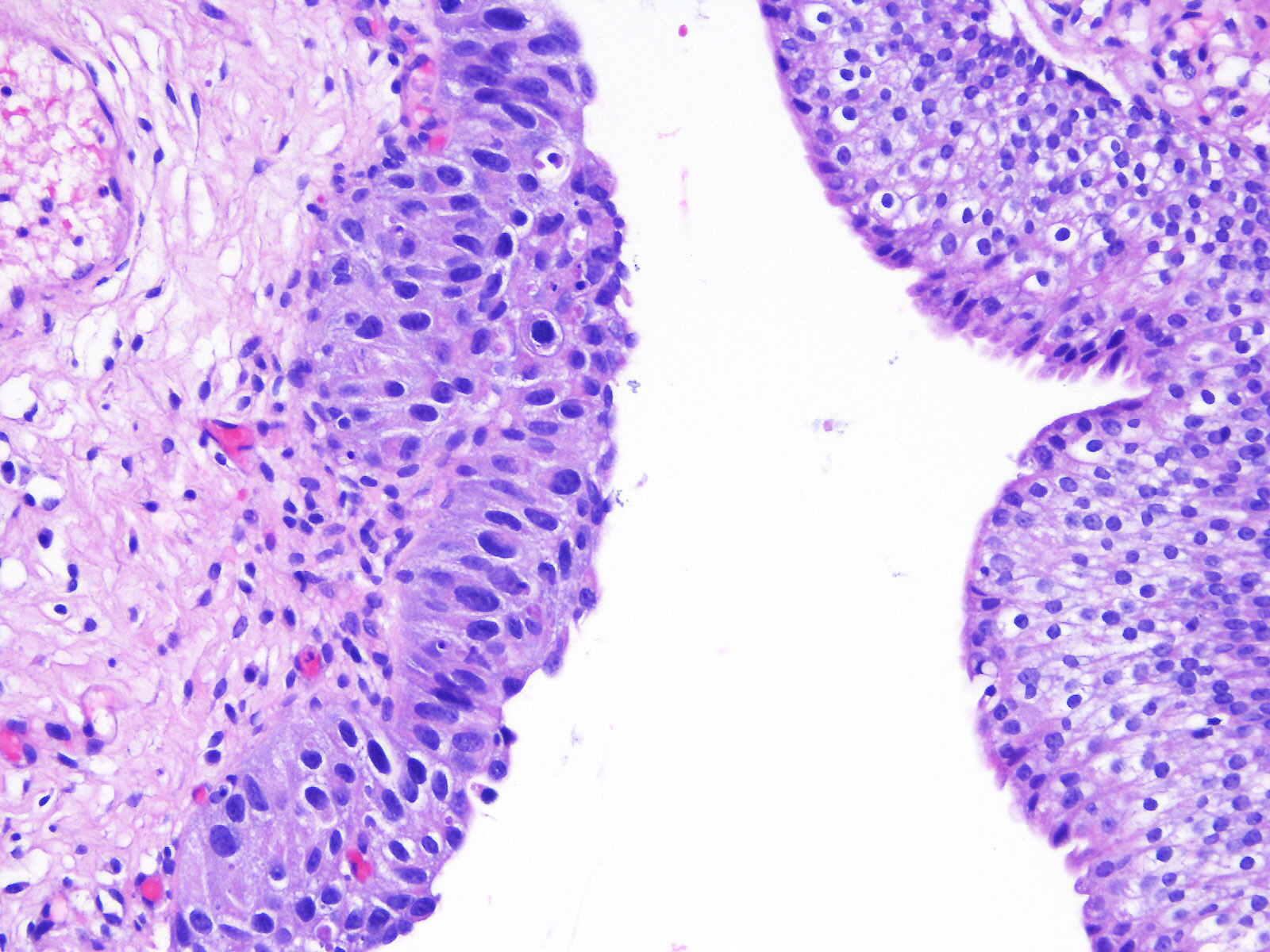 A 60-year-old man had atypical urothelial cells on urine cytology. Cystoscopy revealed several lesions in the bladder that were biopsied. He had a history of bladder urothelial CIS treated with intravesical BCG therapy and 3-month follow-up cystoscopies and cytologies were unremarkable.