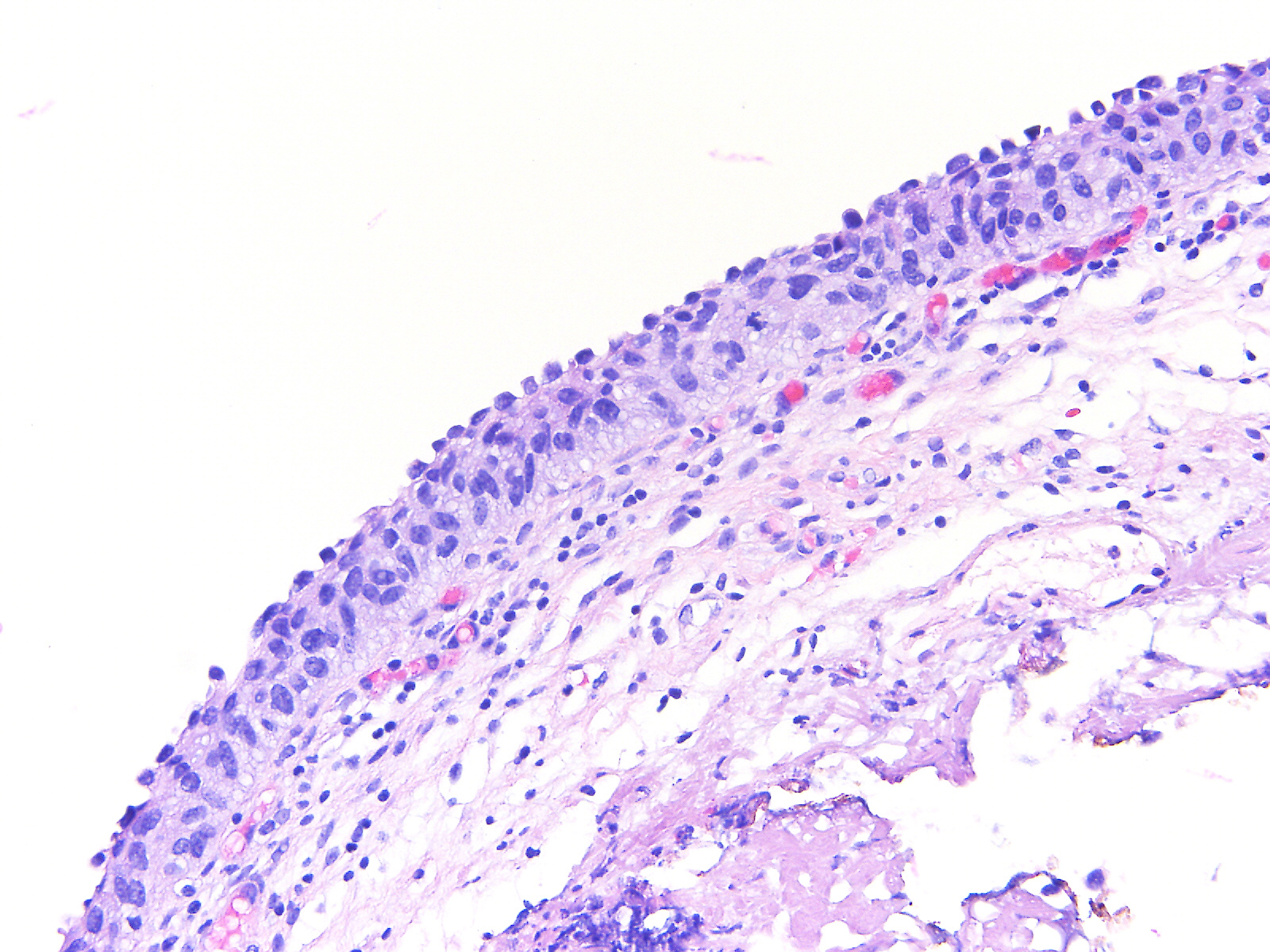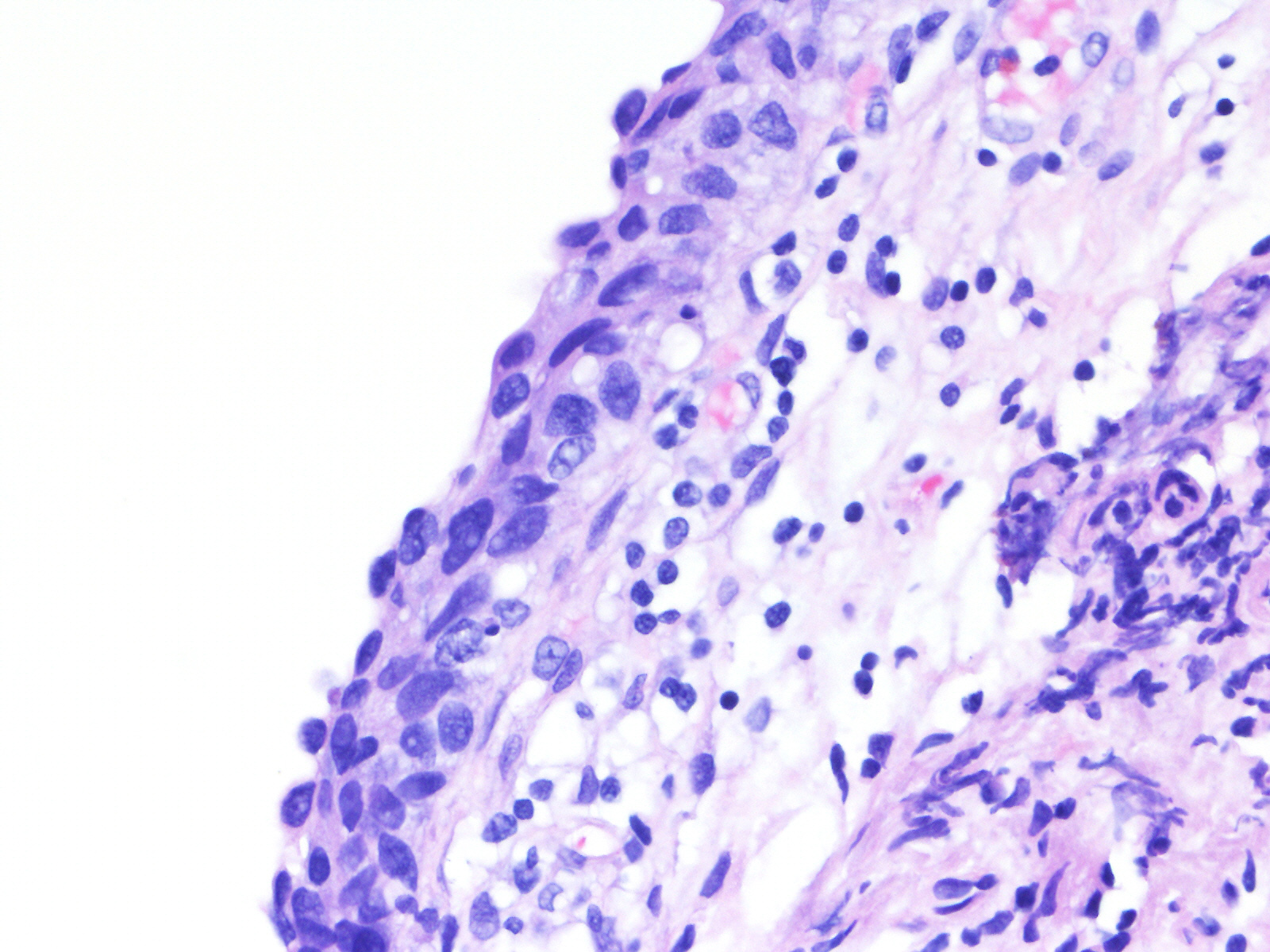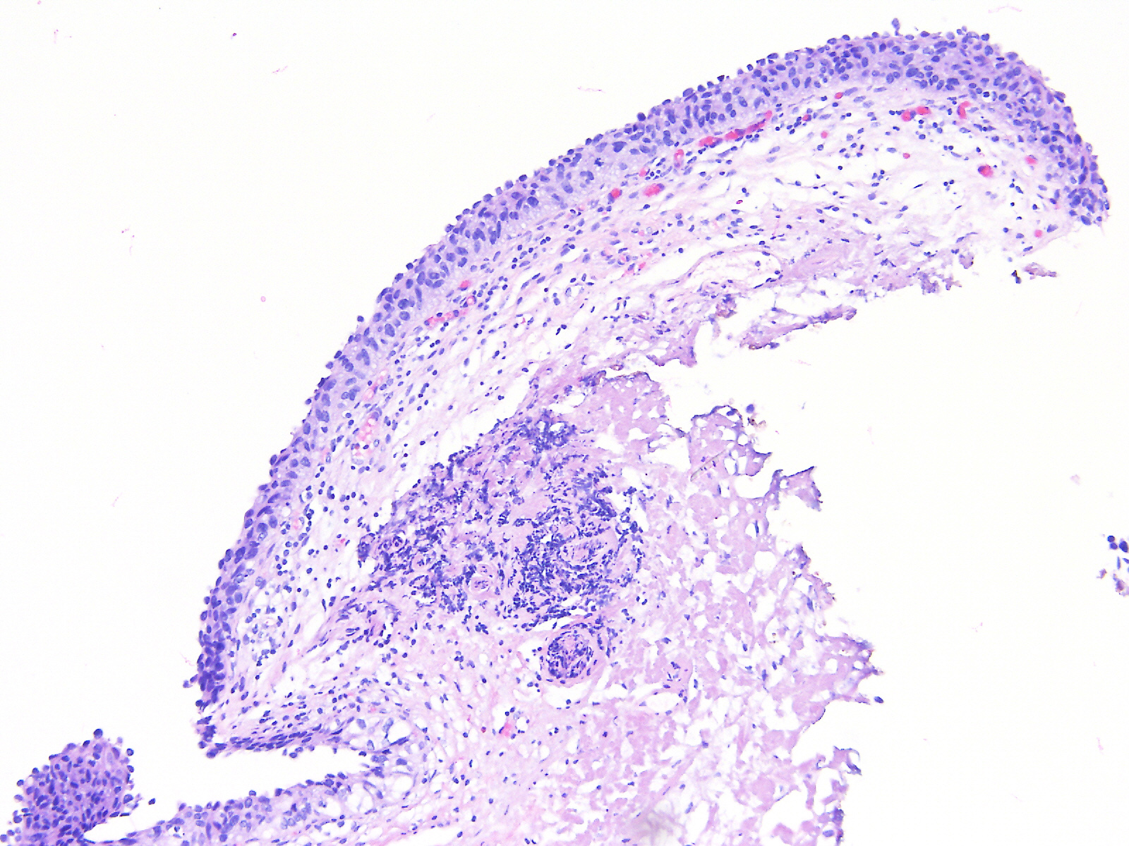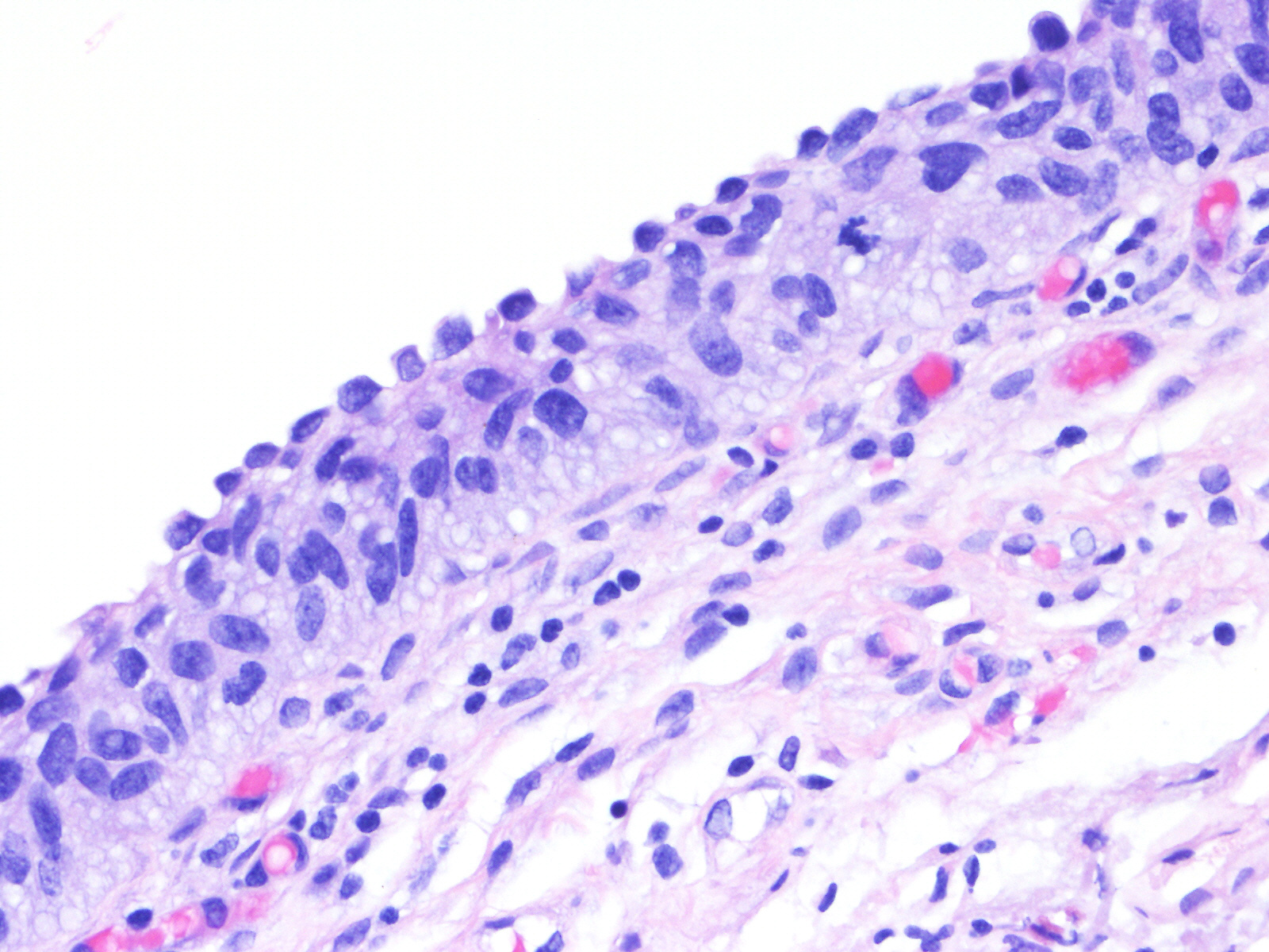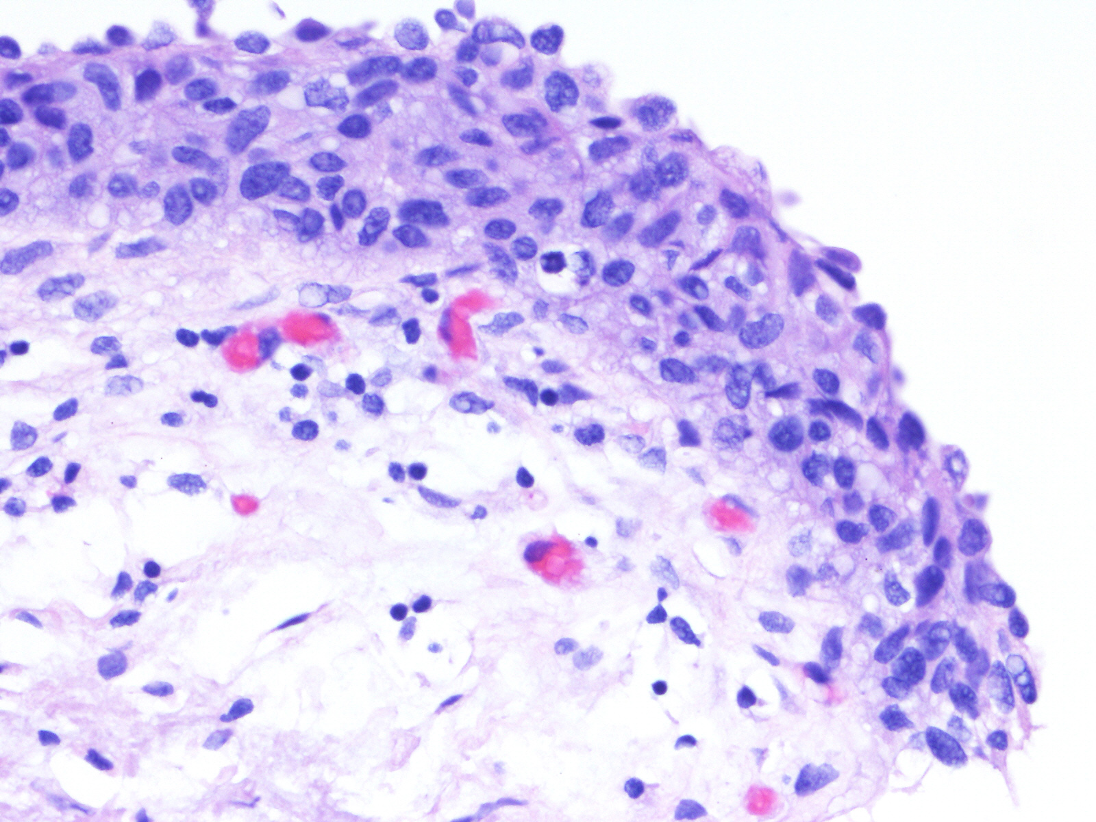 A 60-year-old female underwent a bladder cystoscopy and biopsy of a 2-cm erythematous lesion at the right posterior bladder wall. About 5 years ago, she was diagnosed with pT1 bladder urothelial carcinoma treated with intravesical therapy.