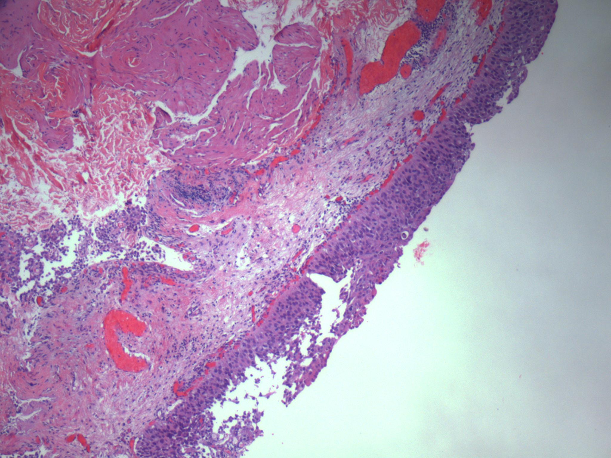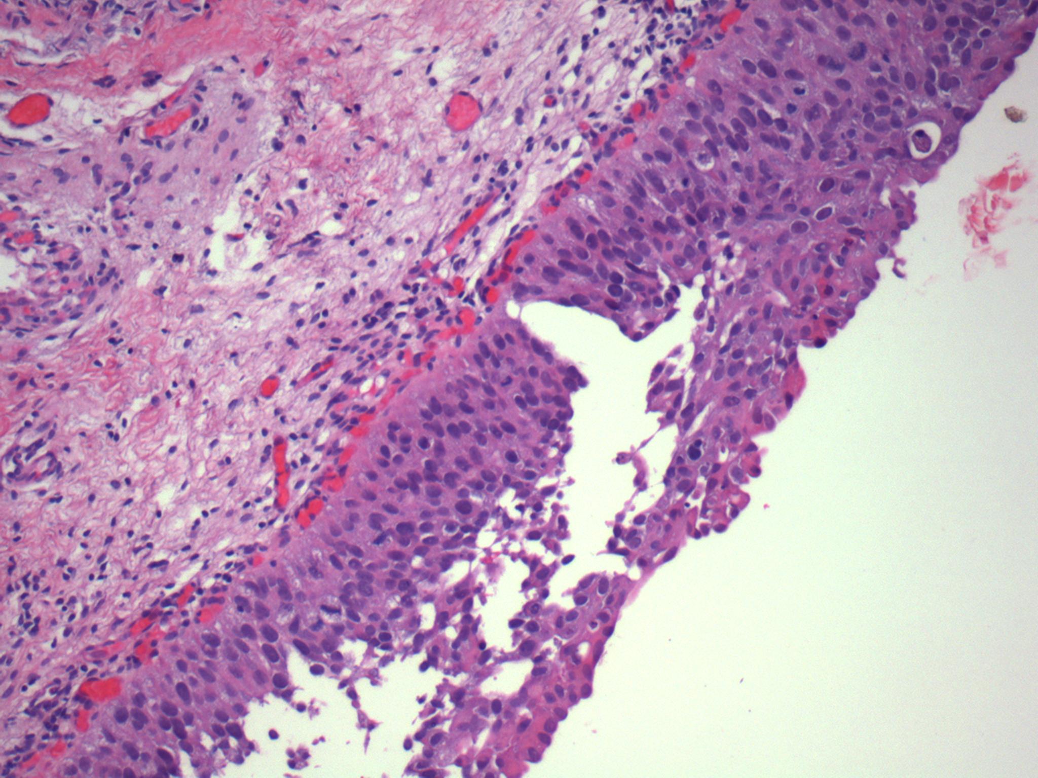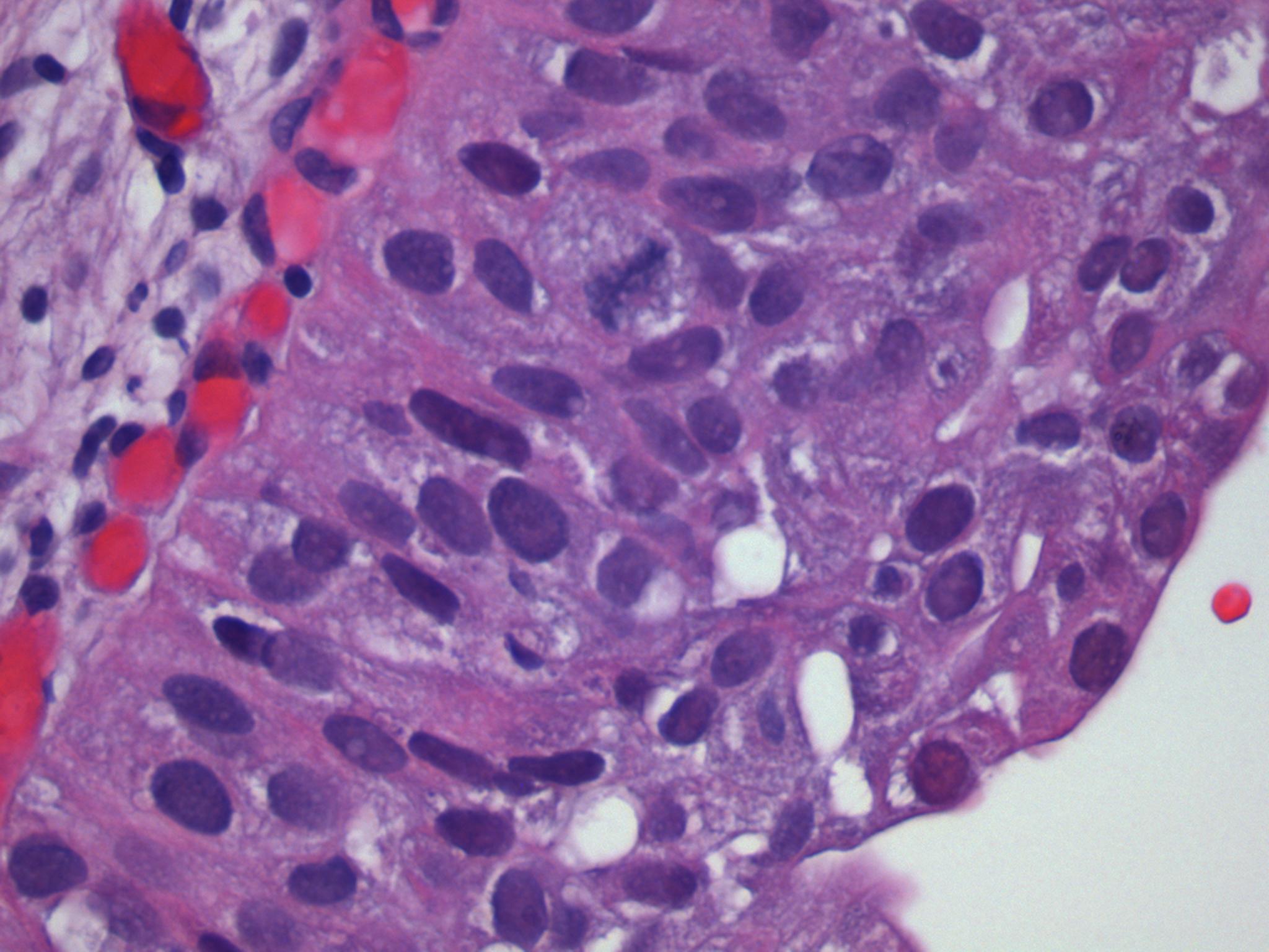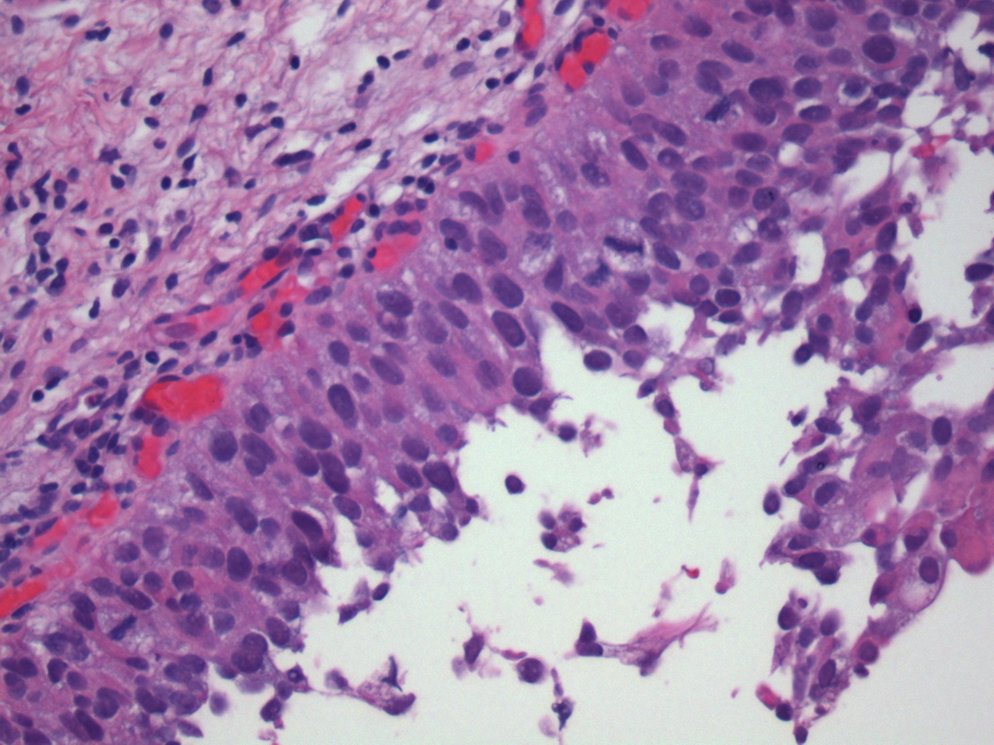 The urothelium displays loss of cohesion, loss of polarity and prominent pleomorphism.