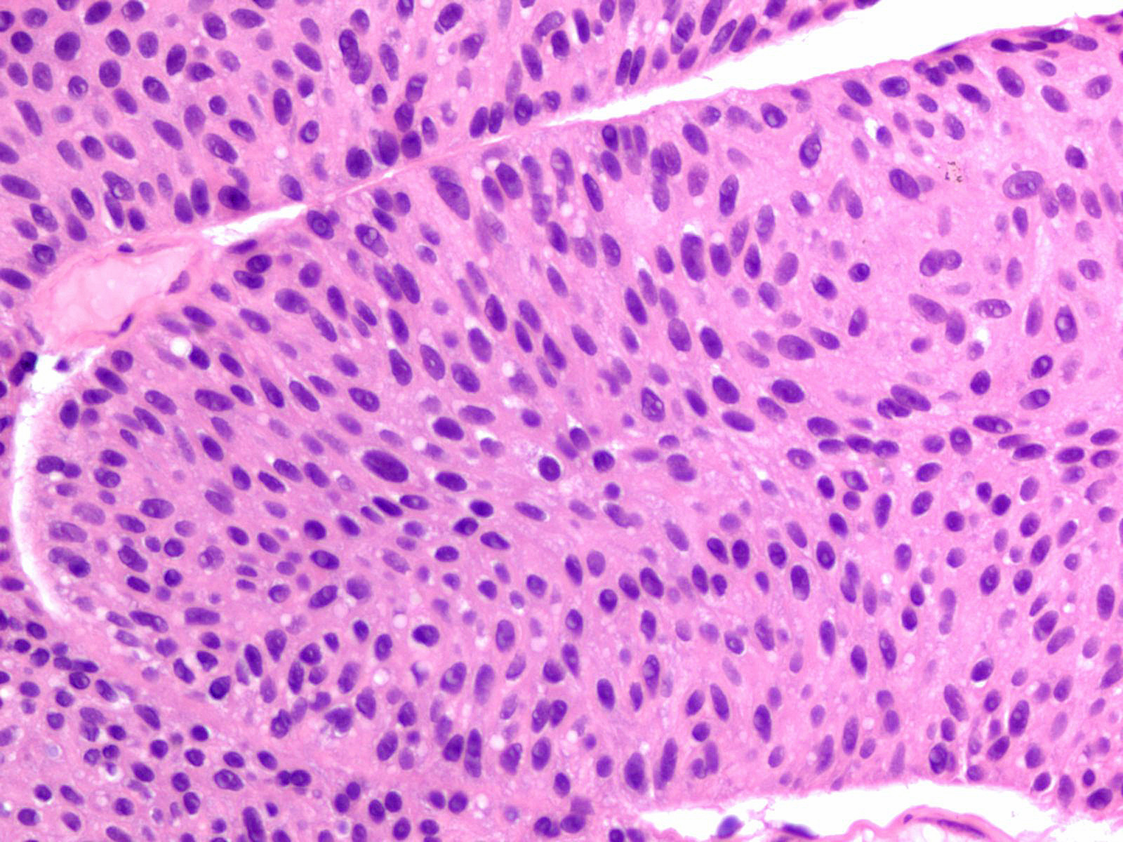Lesion shows moderate variation in nuclear size, shape and chromatin. Scattered nuclei are significantly enlarged and hyperchromatic relative to other nuclei. Lesion still maintains an overall orderly appearance.