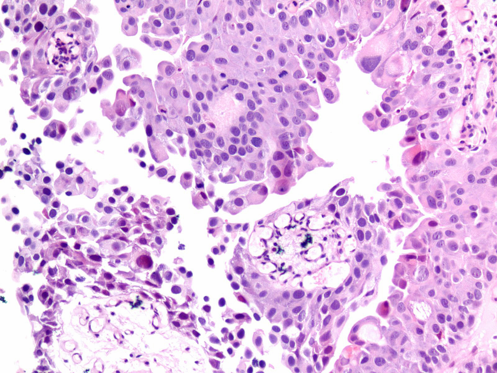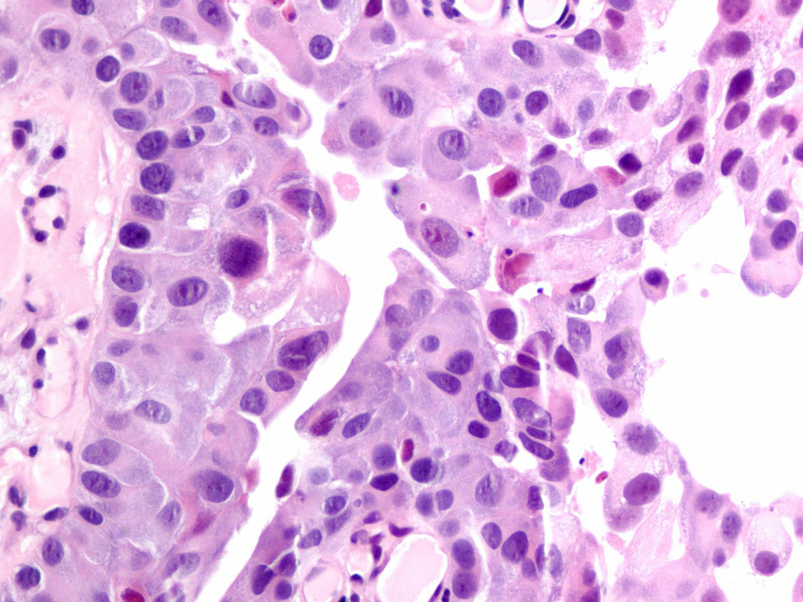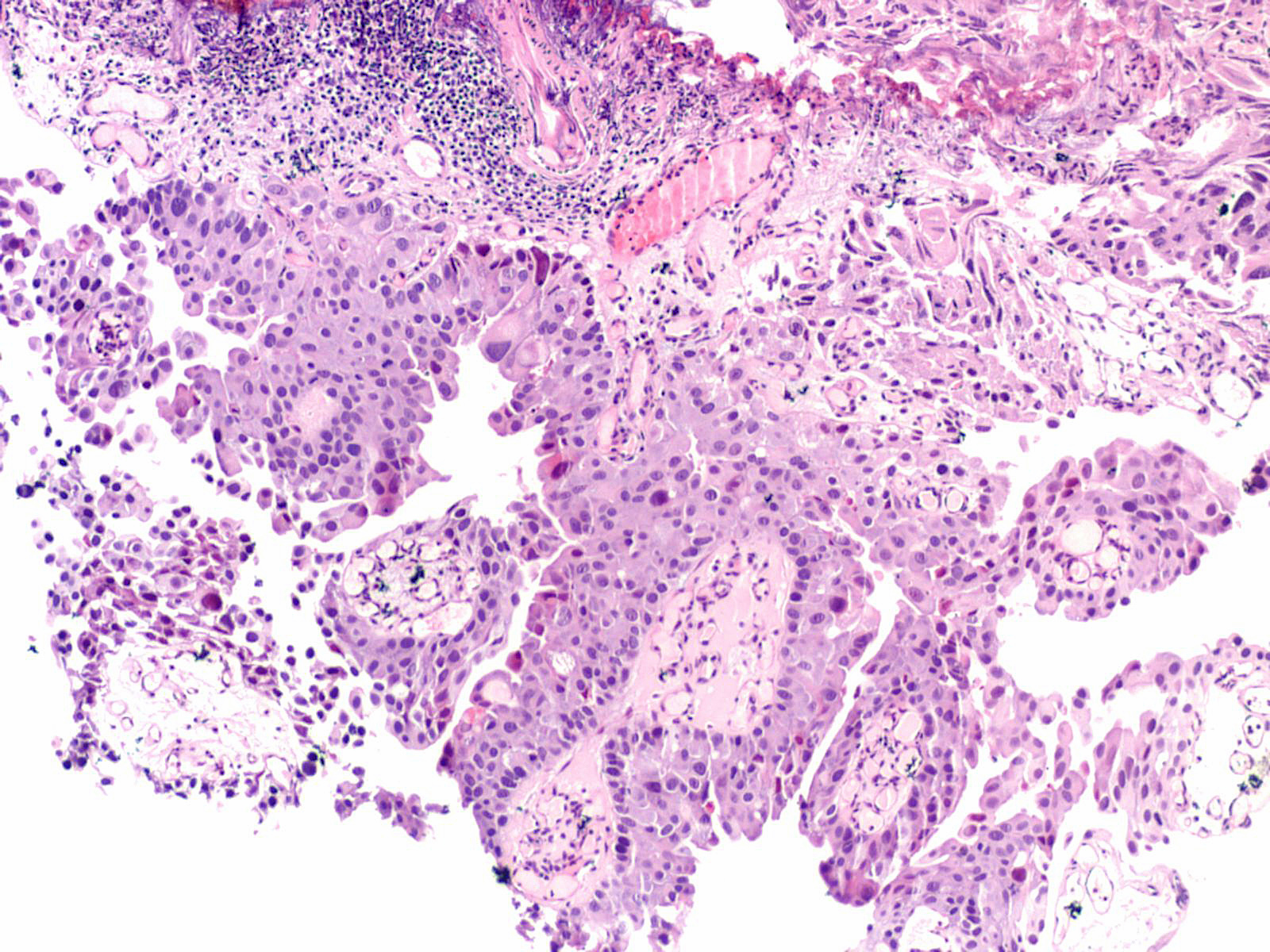 Lesion shows marked variation in nuclear size, shape and chromatin. Architecturally, cells appear loosely cohesive and the epithelium is disorganized. Mitotic figures are seen.